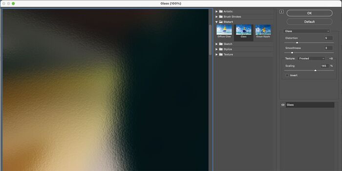 В меню Distort для Glass вы можете поиграть с различными эффектами, но мы рекомендуем следующие настройки: Distortion ( Искажение) — 5, Smoothness ( Сглаживание) — 3, Texture (Текстура) — Frosted (Фрост) и Scaling ( Масштаб) — 145%. Это может меняться в зависимости от вашего изображения и желаемых результатов. Когда вы будете довольны окном предварительного просмотра, нажмите OK .