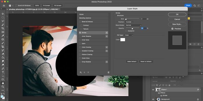 Выделив фигуру, щелкните fx на панели слоев и выберите Stroke . В окне Layer Style установите следующие свойства: Size (Размер) на 4px, Position (Положение) на Outside (Снаружи), Blend Mode (Режим наложения) на Normal (Обычный) и Opacity (Непрозрачность) на 50%. Убедитесь, что Overprint (Наложение ) не отмечен. Установите Fill Type (Тип заливки) на Color (Цвет), а цвет — белый (FFFFFF).