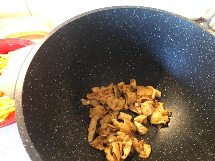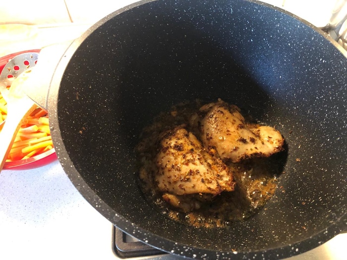 Затем обжариваем лук до золотистого, кладём морковь, прибавляем газ и обжариваем , пока морковь не отдаст воду и значительно уменьшится в объёме, добавляем туда же замечательную смесь, оставшуюся после маринования окорочков. Затем кладём мясо, перемешиваем и обжариваем минут пять, чтобы мясо впитало в себя все ароматы. Теперь заливаем всё кипятком, убавляем огонь и тушим минут 15. Минут за пять до конца добавляем специи, солим и наш зирвак готов. Помним, что зирвак должен быть хорошо солёный, перчёный и ощущаться вкус специй, потому, что это всё заберёт рис.