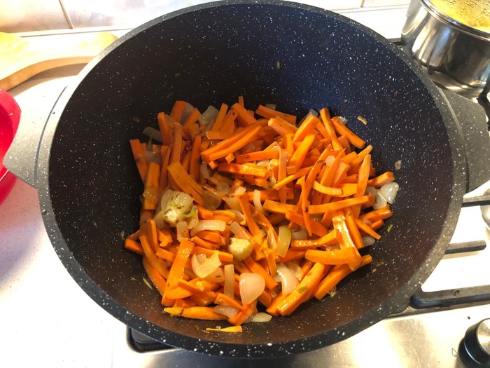 после этого добавляем в наш казан морковь. Морковь надо так же как и мясо нарезать достаточно крупно, иначе она превратиться в кисель. Я нарезаю морковь соломкой, так красивее в готовом блюде смотрится. Морковь высыпаем в казан, но не мешаем. Даём ей обязательно прогреться 3-5 минут, иначе мы резко охладим содержимое казана и ничего хорошего с этого не выйдет.