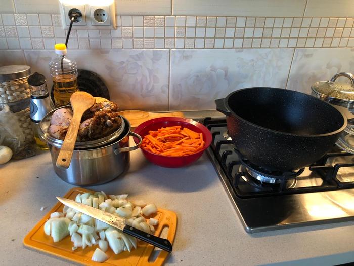 На 4 хороших таких окорока я взял 5-6 средних луковиц, 1 кг моркови( люблю морковь в плове) и 400 грамм риса. Давно бросил покупать у узбеков рис-девзиру, которая сейчас стоит, как хорошая баранина, покупаю любой хороший длиннозернистый, пропаренный рис.