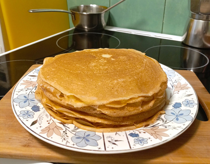 Порой, когда удаётся встать пораньше, приходит мысль испечь на завтрак блинчиков. В этот раз кефира в доме не случилось, но была в избытке ряженка, на ней и решено было сделать тесто. Собственно, технология и пропорции блинчиков на ряженке ничем не отличаются от «кефирных», разве что во вкусе присутствует нотка топлёного молока. Если делать всё по рецепту (я называю это «формулой 300/500/300»), стабильный результат гарантирован.