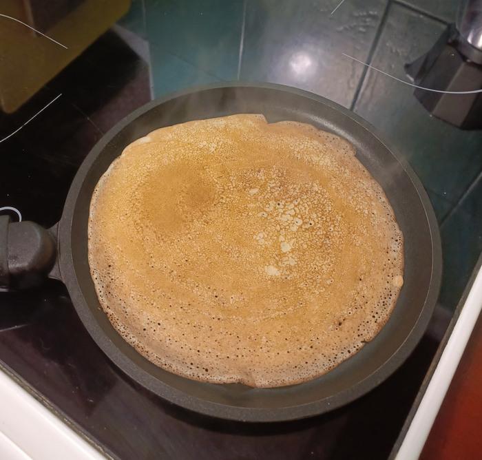 Отмечу, что хорошую сковороду с антипригарным покрытием не требуется смазывать маслом, достаточно того, что в тесте. Разве что первый раз для подстраховки можно слегка помазать кисточкой.