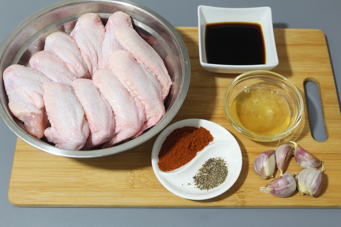 Для приготовления понадобится: крылья куриные 1 кг чеснок 4 - 5 зубчиков соевый соус 50 мл перец черный молотый 1 ч. л паприка молотая 1 ст. л мед 1 ст. л