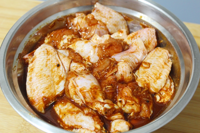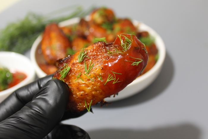 2. К крыльям добавляем чеснок, измельченный любым удобным способом, и все оставшиеся приправы. Любители острого могут включить в состав красный жгучий перец. Замаринованные куриные конечности убрать в холодильник на пару часов.
