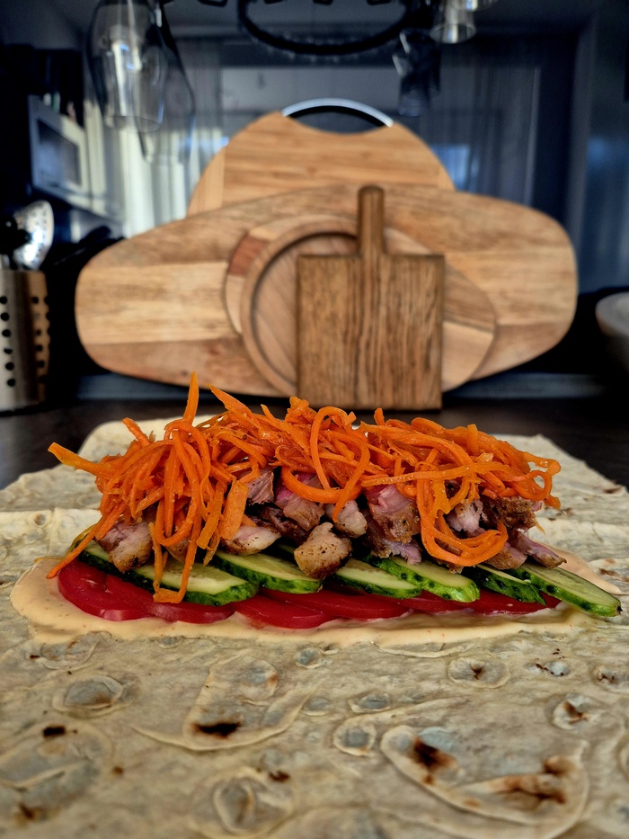 Собираем шаурму: на лаваш, отойдя от края сантиметров пятнадцать, мажем смесь майонеза и шрирачи (пропорцию выбирайте по своему вкусу), выкладываем овощи и мясо.