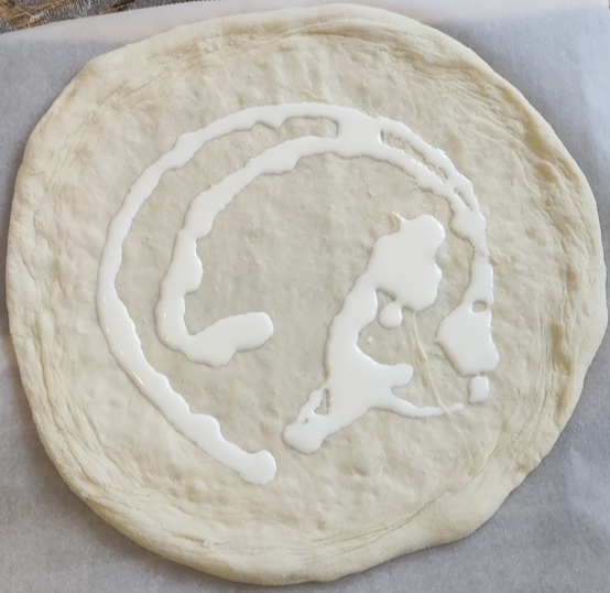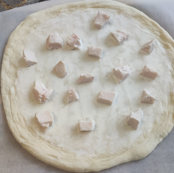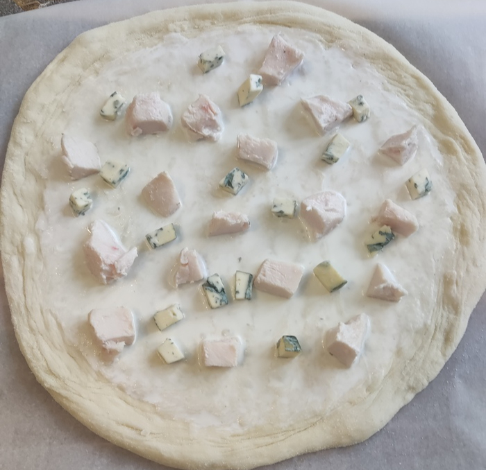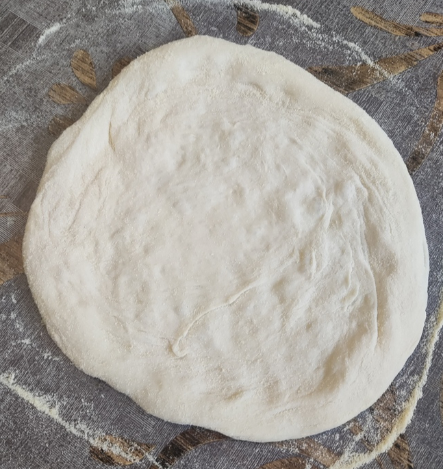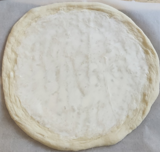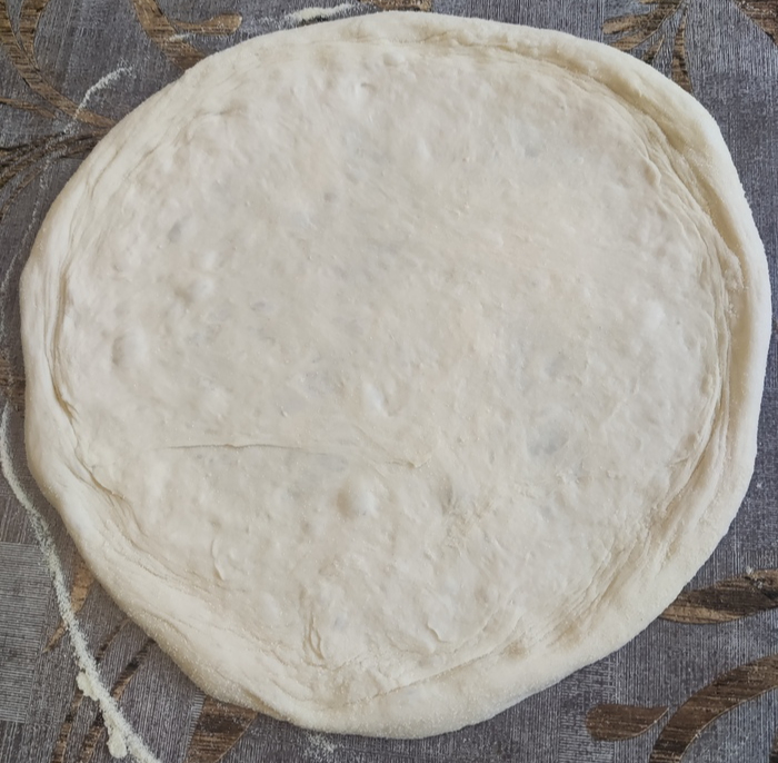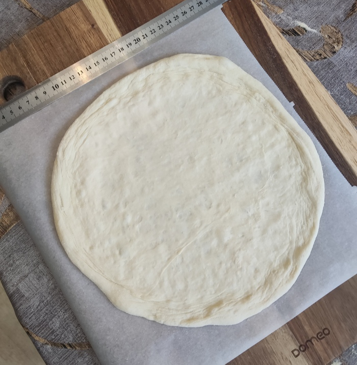 Достаем и растягиваем тесто. Я при этом использую кукурузную муку, но можно обойтись и пшеничной. После растяжки перекладываем основу на лист пергамента для выпечки. Особая круглость не требуется.