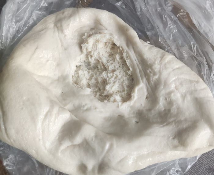 Тесто поднялось, на ощупь мягкое, пахнет дрожжами и немного спиртом.