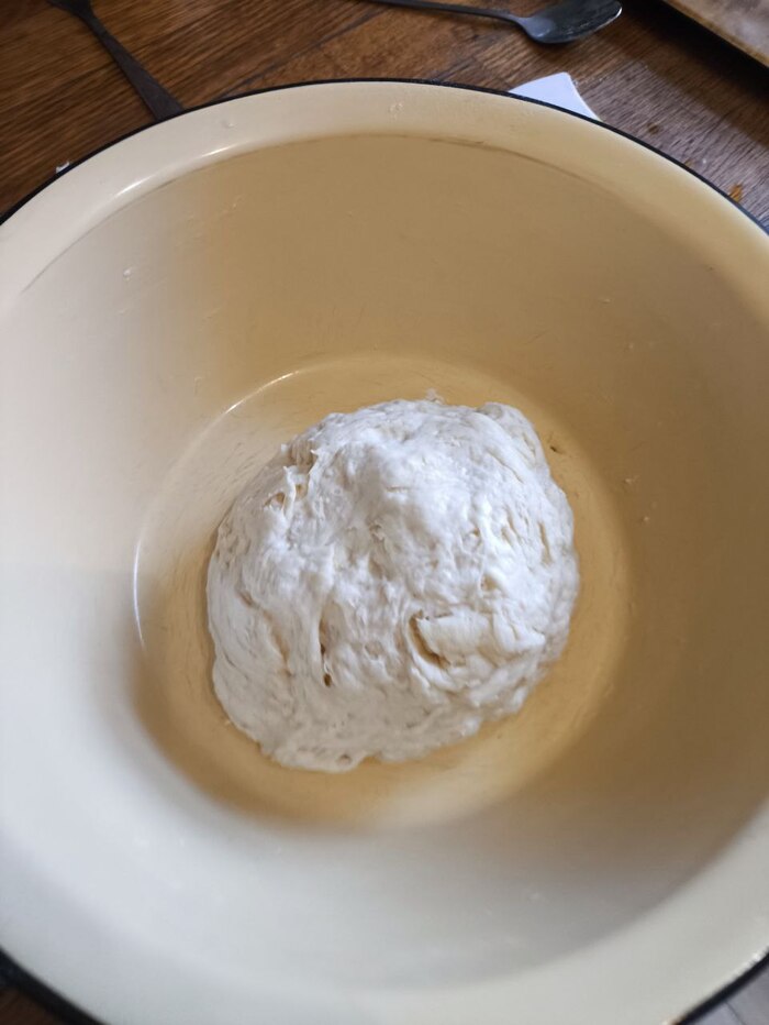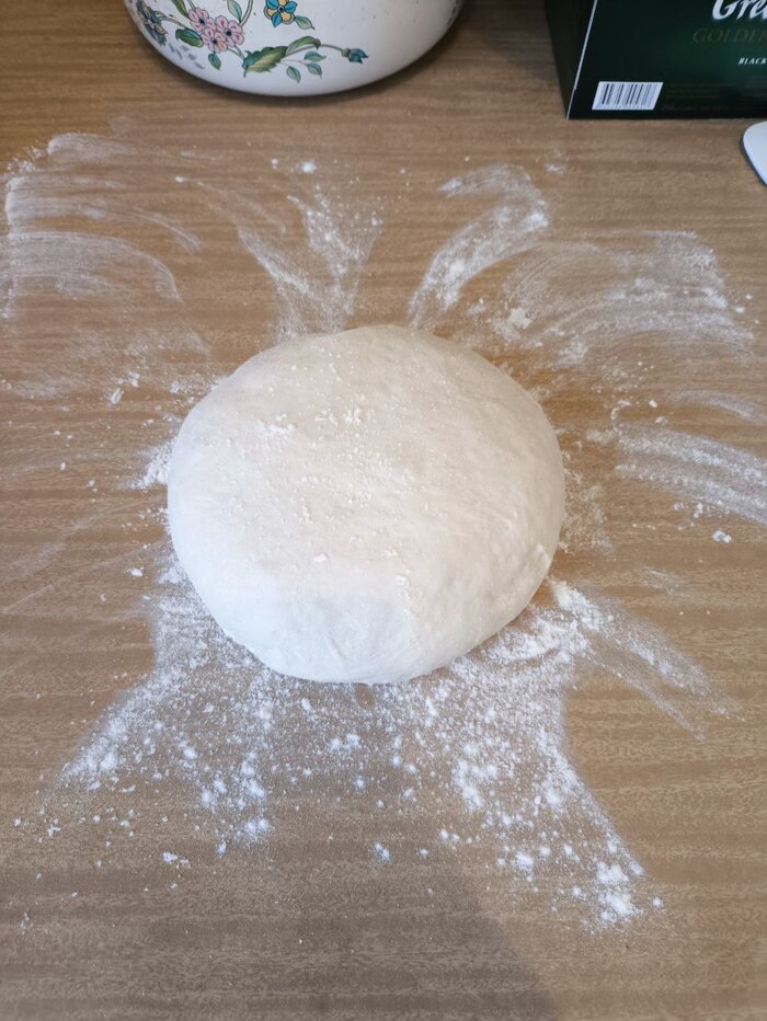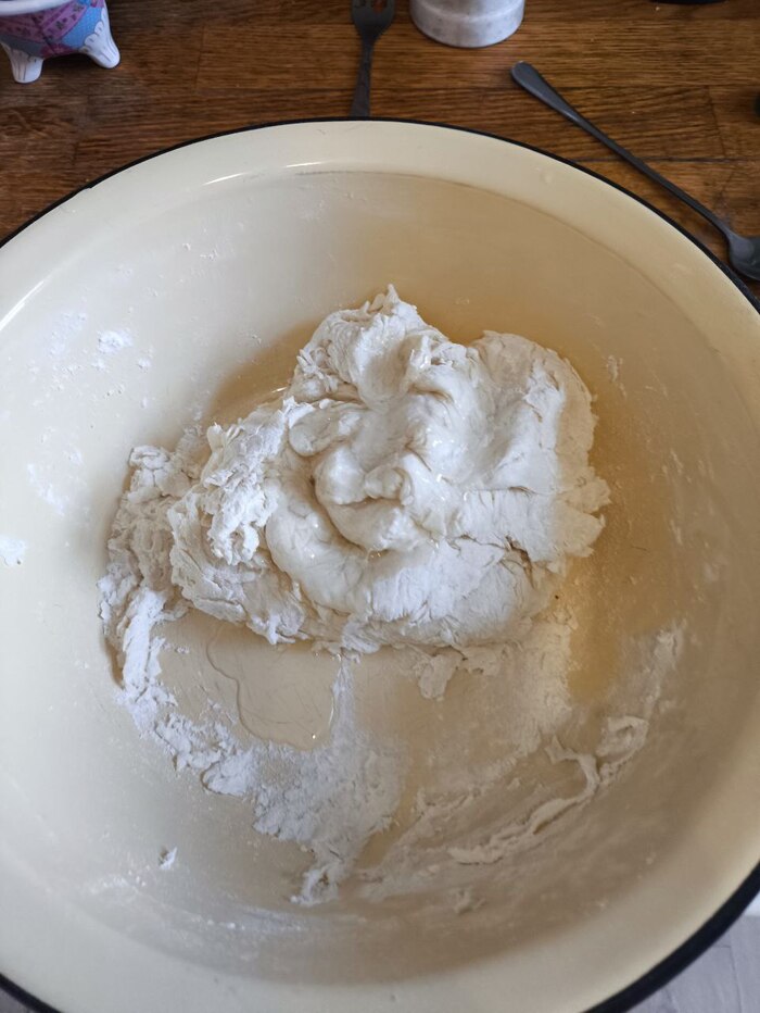 2) Обильно припылить стол, вывалить тесто с помощью скребка, подмешать и сформировать шарик