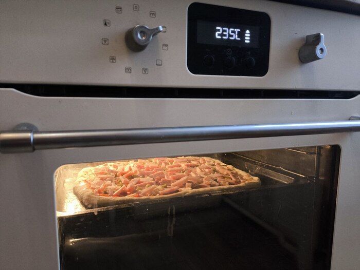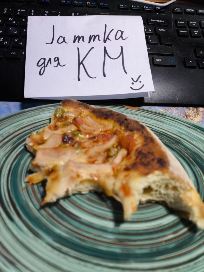 Немного задуплил, минут на 10, за компом дописывая блок поста. Пицца провела в режиме верх-низ + конвекция минут 15, от чего сыр "выкипел", осел и колбаса начала подгорать... Бортик вообще стал тёмно-коричневым))