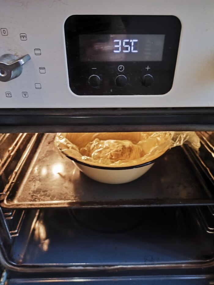 8) Накрываем каким-то пакетиком/пленкой, пихаем в духовку на 30-35 градусов и идём за компик скроллить Пикабушку. Можно забыть о тесте на минут 30-60. Если заснёте и завтычите часа на два, тоже ничего страшного.
