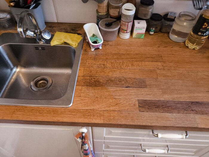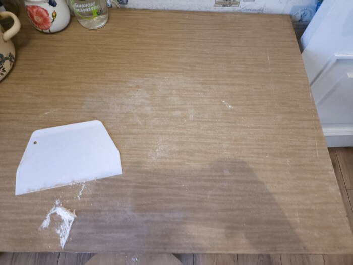 5-6) Наводим порядок. По столу проходимся шпателем, а потом остатки муки протираем влажной тряпкой. 3 тарелки, доску, шпатель с лопаткой моем. Ушло минут 5 параллельно с выпеканием.