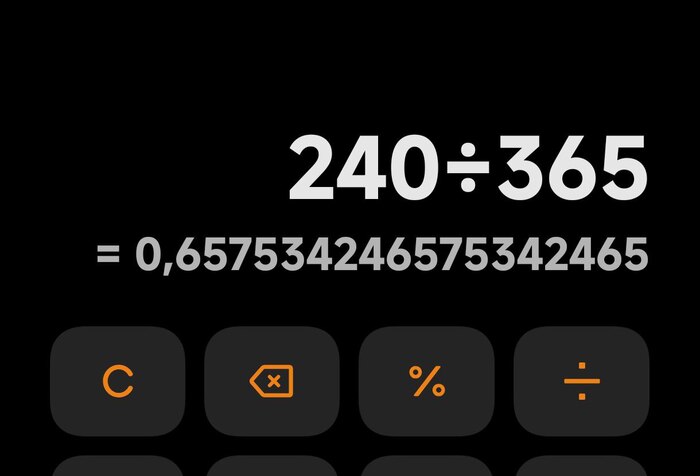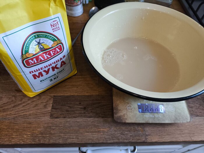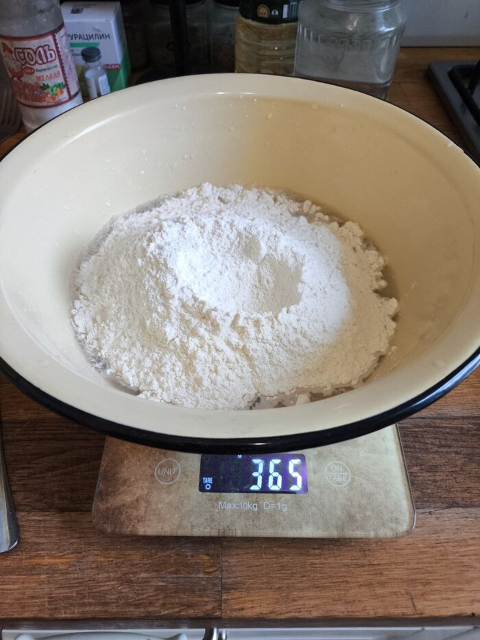 На калькуляторе считаем примерную пропорцию и получаем нам нужно 240 г воды и 365г муки.