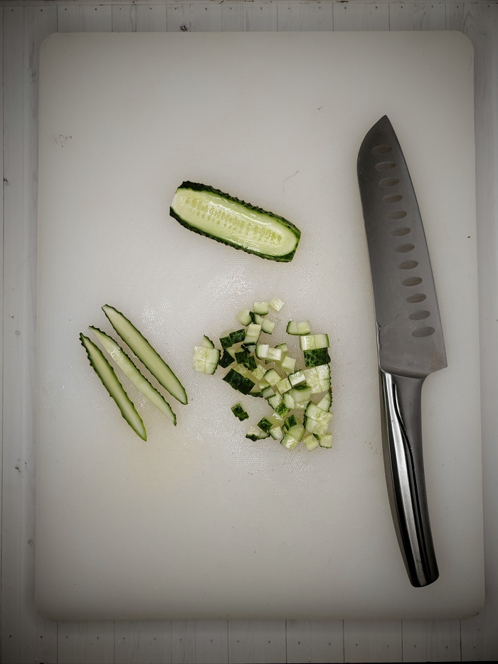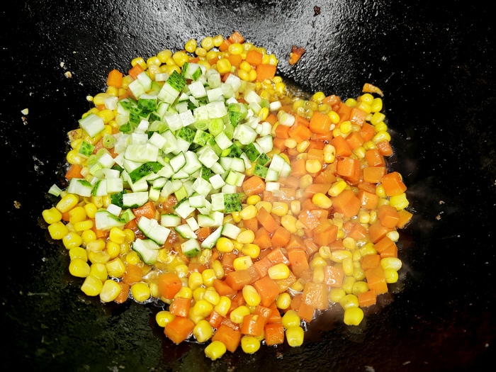 18. Отправляем жариться огурец и белые части зелёного лука. По сути, просто прогреваем их.