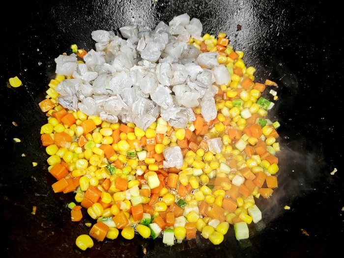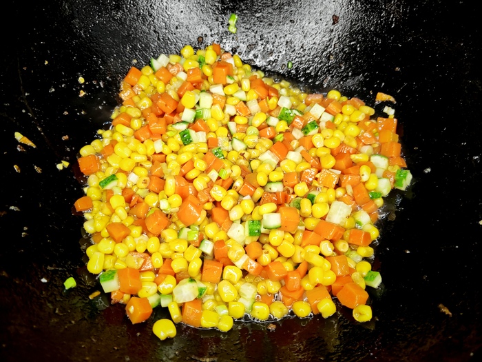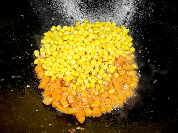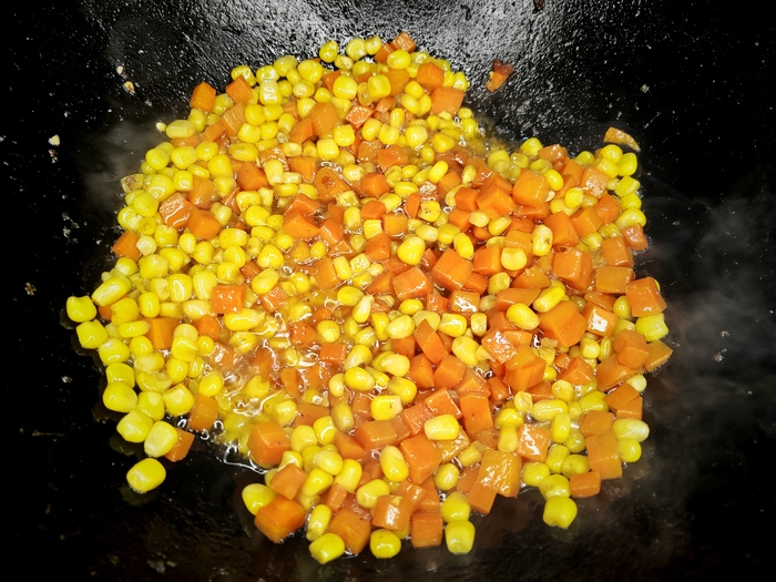 17. Сливаем жыжу из банки с кукурузой и отправляем кукурузу к моркве. Выпариваем всю жидкость, добавляем вторую половину рисового уксуса. Ещё чуть-чуть прогреваем.