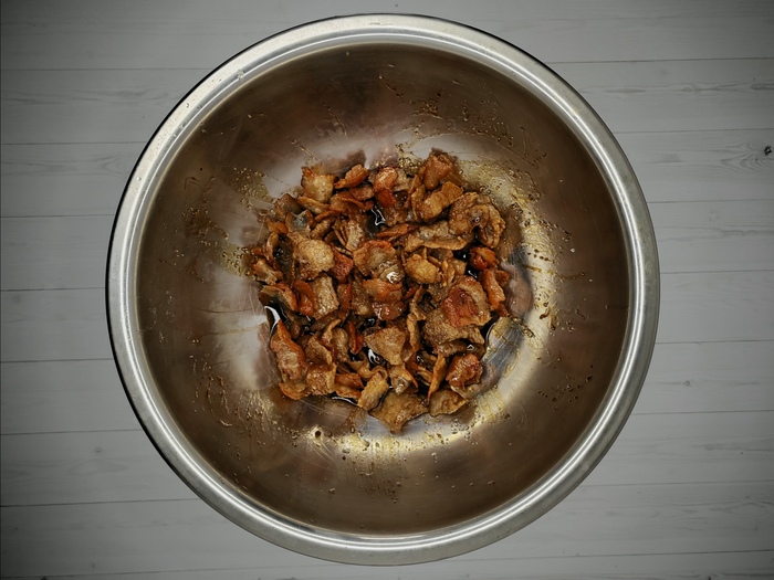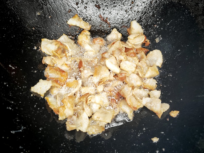 14. Кидаем в казан свинину и обжариваем её, практически, до состояния чипсов.
