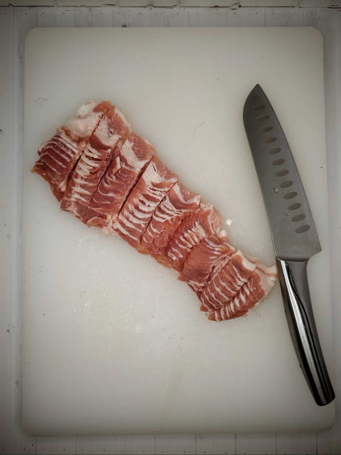 9. Белые части зелёного лука тоже +/- такими же к кусочками шинкуем. Зелёные части перьев режем на куски 2-3 см длиной.