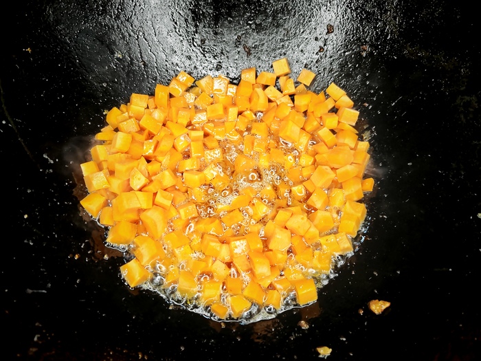16. При необходимости доливаем масла в казан/вок, разогреваем его и отправляем туда моркву. Жарим минут пять.