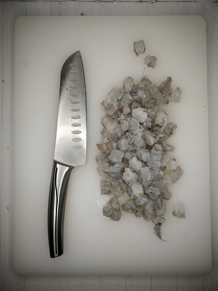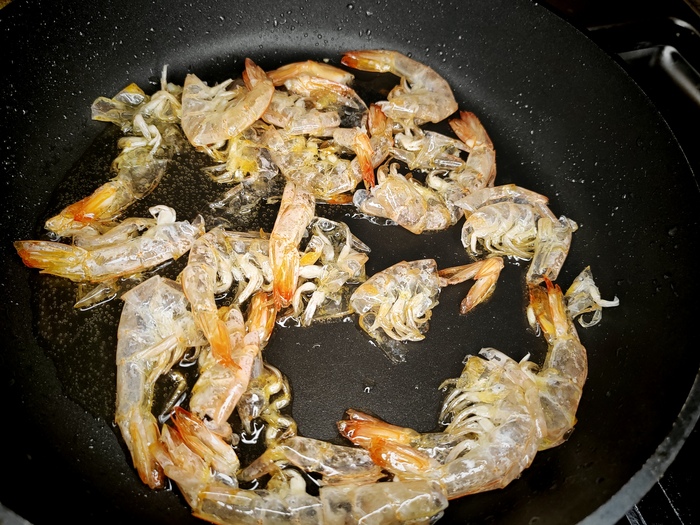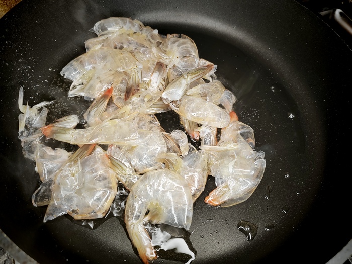 1. "Разденем" креветок. И не надо втирать мне про объективацию оных. Я и сам понимаю, что это пищевая объективация членистоногих. Более того, считаю, что это нормально. Как раздеваем? Берём кухонные ножницы и разрезаем панцирь по спине начиная с той стороны, где из креветки росла голова. Если голова, по-прежнему, растет из креветки, то, в общем-то делаем то же самое. Снимаем этот панцирь (не выбрасываем его). После чего выдираем из мяса кишку и промываем тушку.