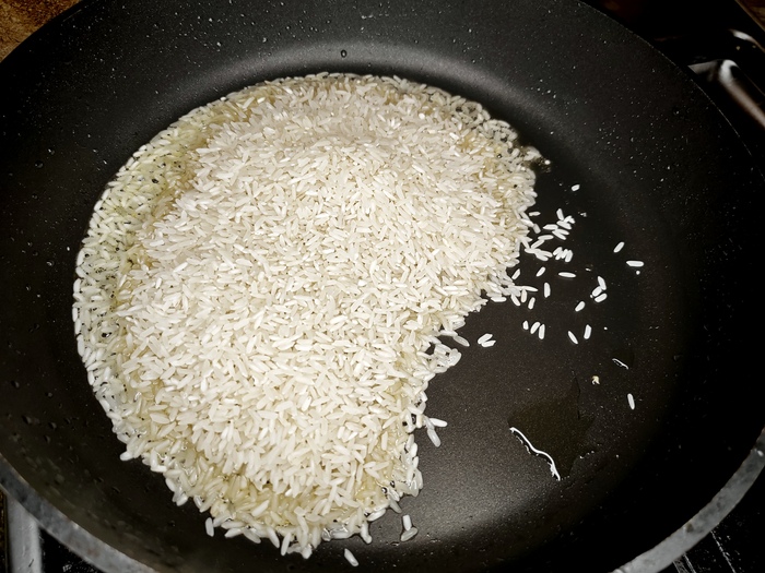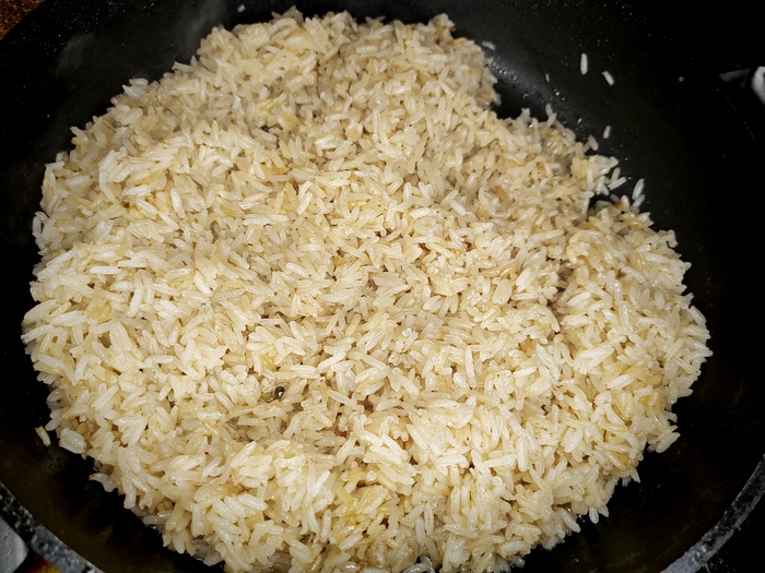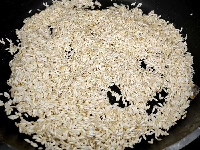 5. Периодически ворошим рис. Он сначала потеряет прозрачность, а потом начнет становиться золотистым. Главное не давать рису пригореть.