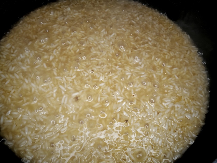 6. Рис зажарился, выливаем к нему воду/бульон. И оставляем кипеть. В какой-то момент вода выкипит, рис нужно будет немного пожарить, поперемешивать, а потом выключить огонь.
