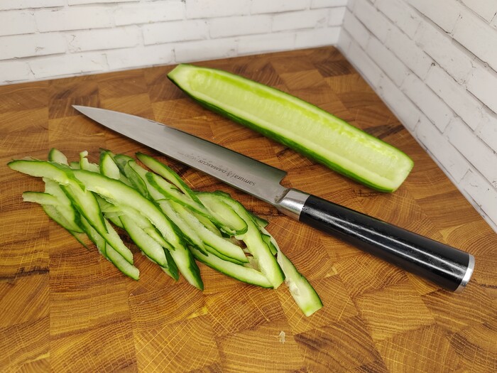 5. Разрежем огурец пополам, вычистим из него семена и тоже тонко пошинкуем.