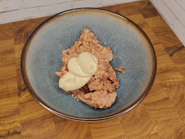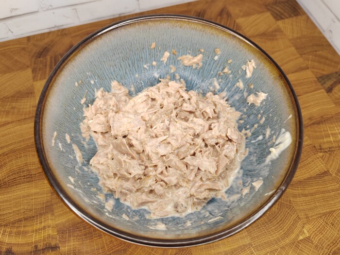 8. Тунца извлечем из банки, сольем всю жижу, разомнем вилкой, добавим мазик