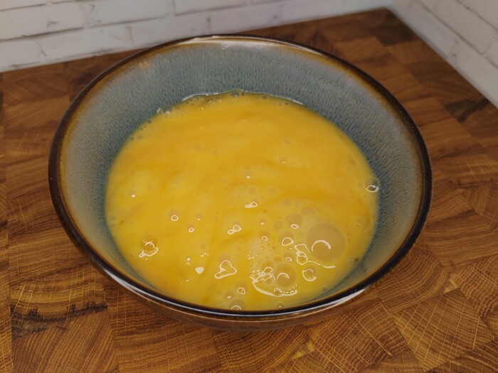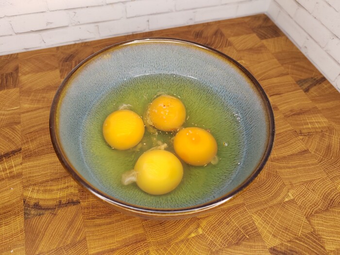 9. Яйца разобьём в плошку, добавим туда щепотку соли.