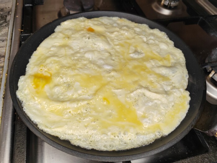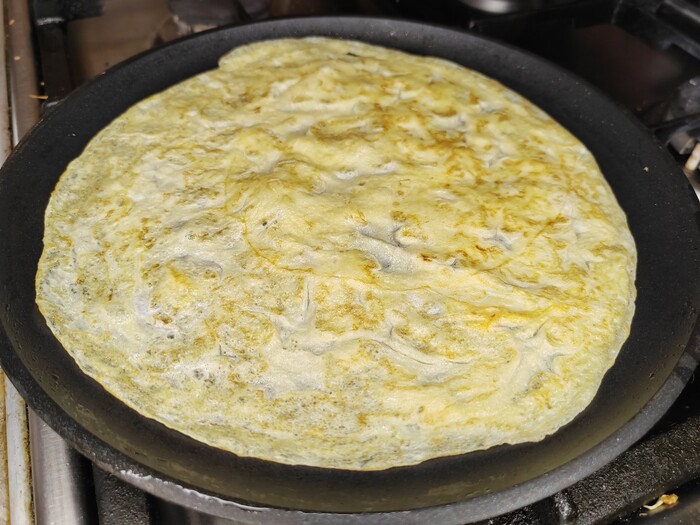 10. Разогреем сковороду, обмажем ее небольшим количеством масла и выльем на неё половник (даже неполный можно) яичной смеси.