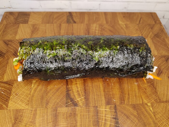 21. После чего смочим, не занятый рисом кусок листа водорослей, водой и докрутим нашу "шаверму". Иногда, кстати, рекомендуют раздавить несколько рисинок, превратив их в этакий клей.