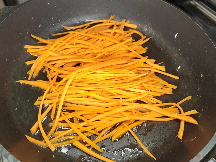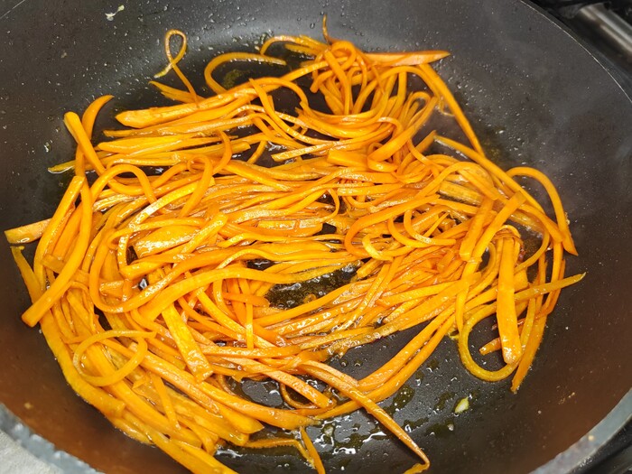 13. Потом на сковороду моркву. Тоже пару минут прогреть.