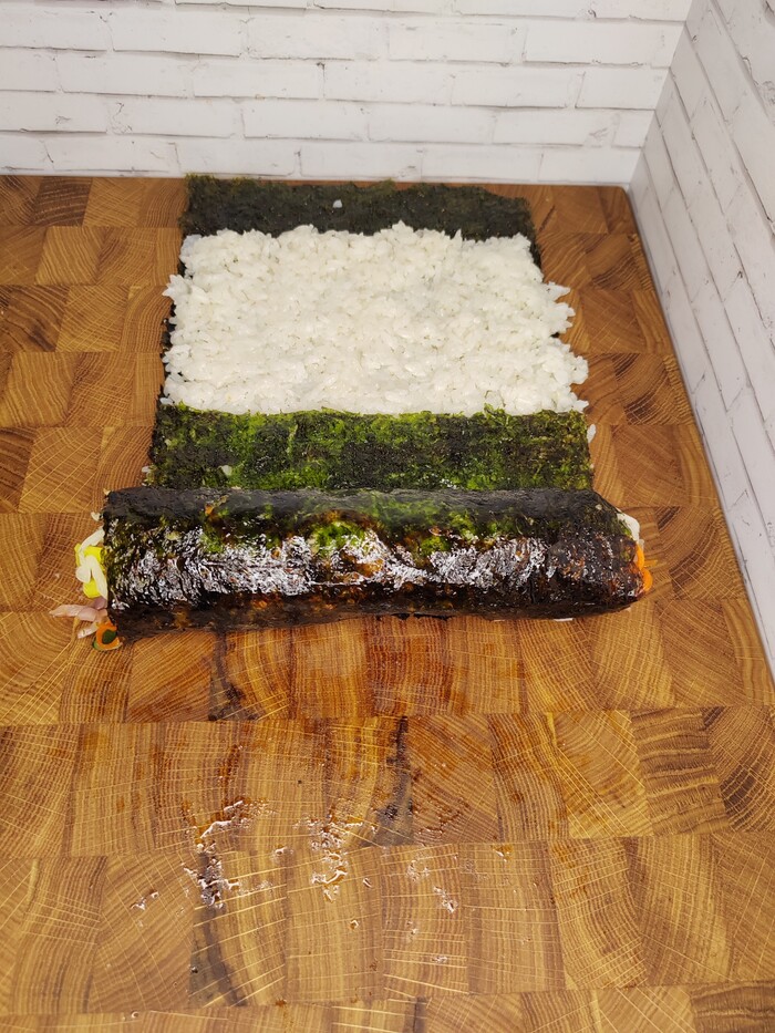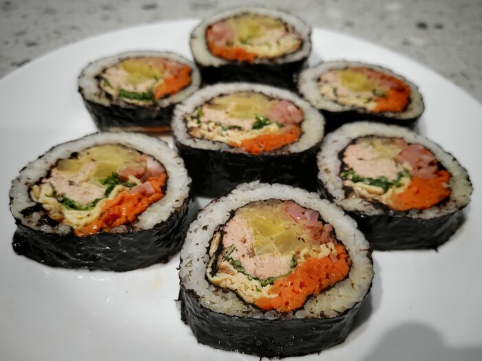На этот раз, кимпаб (김밥). Ким (김) - это водоросли, а паб (밥) - рис. То есть, буквально, рис в водорослях. И если вам показалось, что концептуально это чем-то напоминает японско-американские роллы, то вам не показалось. Кимпаб - это такие специальные корейские роллы. Немного на выживание, ибо обычно они гораздо нажористее. Во многих рецептах пишут, что начинки жалеть не нужно, ибо начинка - это хорошо и надёжно (поспорить с этим сложно), а в итоге кимпабная колбаска (в смысле, кимпаб до нарезки на колобашки) может и полкило весить.