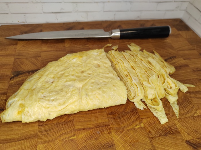 11. Стопку "блинов" сложим пополам и пошинкуем в этакую лапшу.