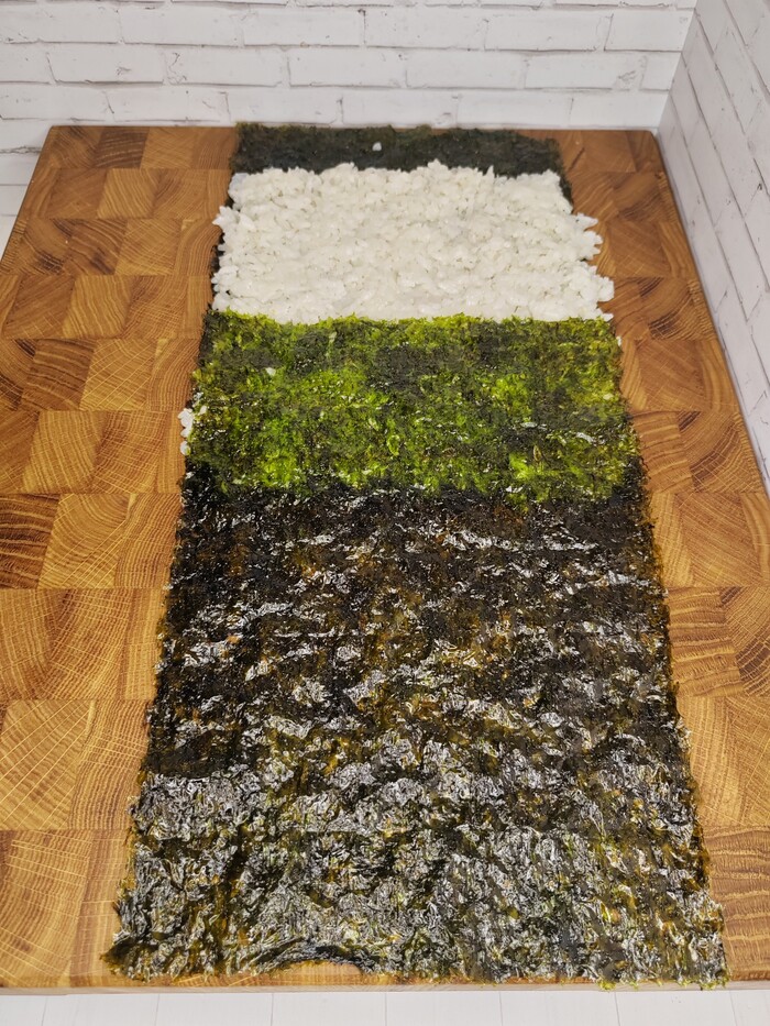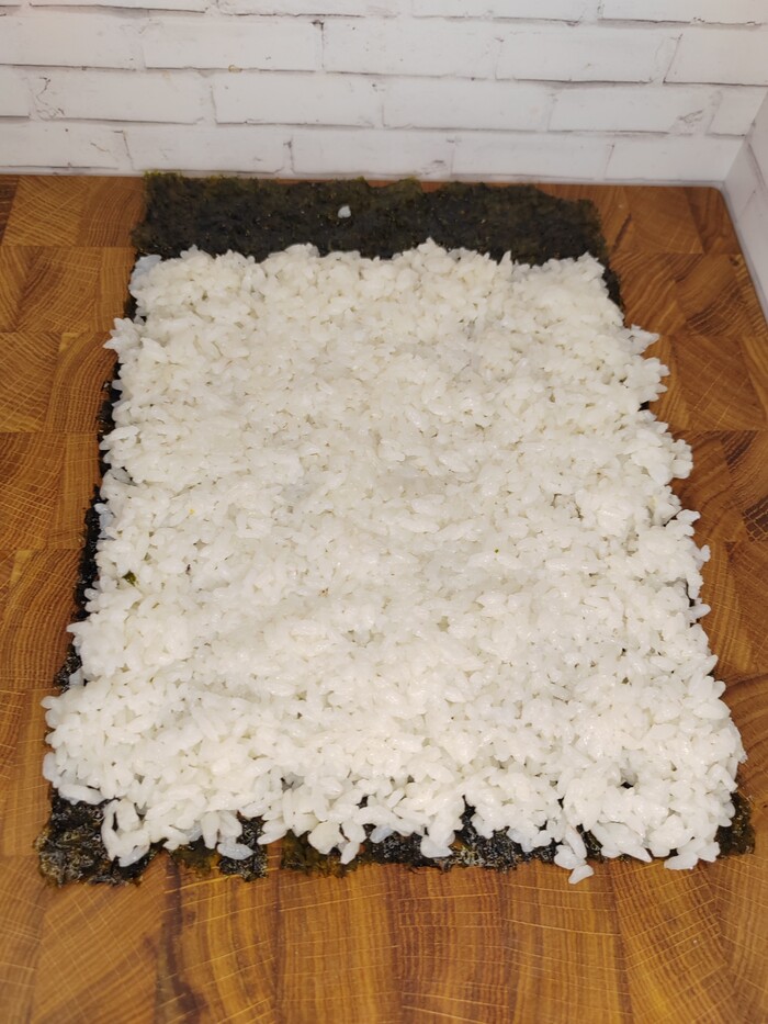 18. Выложим на него сверху второй лист водорослей. Но на этот раз шершавой стороной вниз. Вариант необязательный, но возможный. Если решите так не делать, то начинку нужно выкладывать прямо на рис.