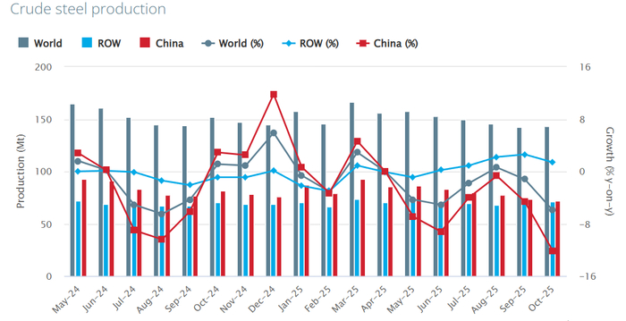 🏭 По данным WSA, в октябре 2025 г. было произведено 143,3 млн тонн стали (-5,9% г/г), месяцем ранее — 141,8 млн тонн стали (-1,6% г/г). По итогам 10 месяцев — 1517,6 млн тонн (-2,1% г/г). Флагман сталелитейщиков (как по производству, так и по потреблению, поэтому от спроса Китая многое зависит) — Китай (50,2% от общего выпуска продукции) произвёл 72 млн тонн (-12,1% г/г), Поднебесная продолжает тянуть всемирное производство за собой (по оценкам аналитиков S&P Global, производство стали в Китае в 2025 г. сократится на 1% г/г), а из топ-10 производителей больше половины в минусе.