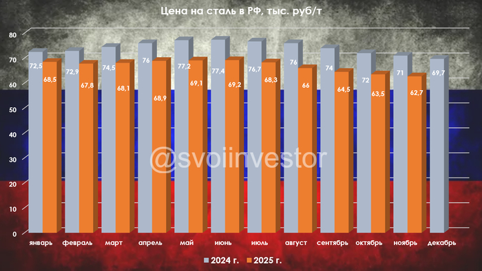 🇷🇺 Как обстоят дела с выпуском стали в России? В октябре было выпущено 5,3 млн тонн (-6,2% г/г), месяцем ранее — 5,2 млн тонн (-3,8% г/г). По итогам 10 месяцев — 56,5 млн тонн (-4,9% г/г). Выпуск стали падает 19 месяцев подряд, во многом сказываются дорогие кредиты (ставка 16,5%), замедляющееся строительство (спрос снизился как внутренний, так и внешний), перестроение логистики, крепкий ₽, санкции, новые налоговые меры, низкая цена на сталь и ремонтные мероприятия на производствах. Всё это отражается в отчётах российских сталеваров: