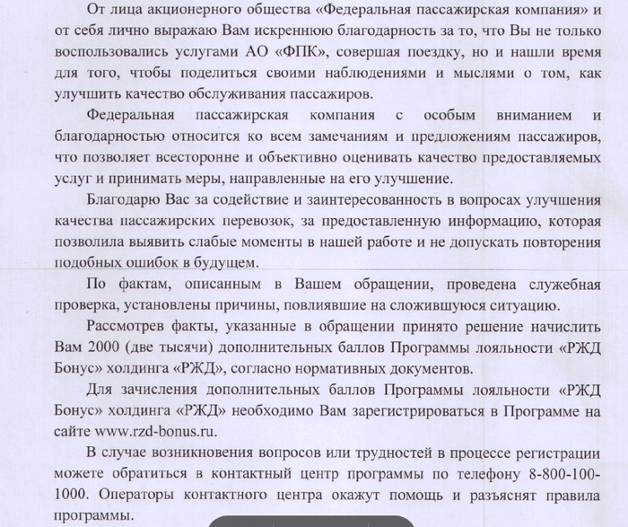 А когда я позвонила сначала на горячую линию РЖД-Бонус, там ну конечно же, никаких поручений начислить мне какие-то бонусы, нет. Тогда я позвонила по телефону который в ответе - местный, с добавочным, там трубку не берут. Тогда я позвонила опять на горячую линию самого РЖД и магические цифры в сорок минут разговора повторились. Два оператора отфутболивая друг к другу очень, очень, очень хотели разобраться (нет) во всей этой ситуации. Моих обращений в системе нет. Но мы, говорят, можем еще раз сформировать ваше обращение и обязательно ответим вам в течении 30 рабочих дней.