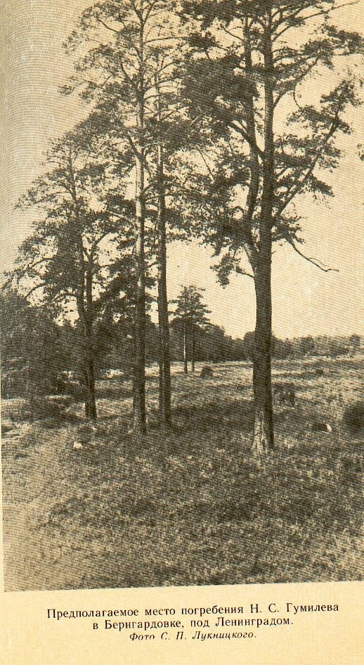 С районом станции Бернгардовки, также со ссылкой на Ахматову, соотносит место расстрела Гумилева и А.С. Федоров. Но И.Н. Пунина, вспоминая поездку с Ахматовой на автомобиле, указывает район Пороховых:
