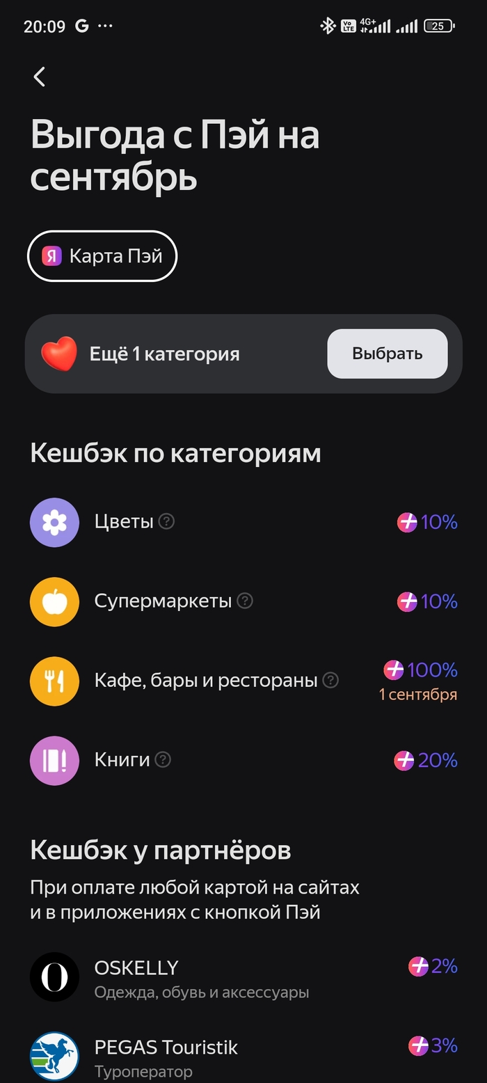 Однако вчера где-то в 13 часов случайно вычитал, что при совпадении 3 категорий кэшбэка в яндекс пэй они дают 2000 баллов за любую покупку в ресторанах. И это идеальный шанс, подумал я. Но свои категории я уже выбрал за день до этого, а на других аккаунтах семьи вроде как пэй никогда не было. Я попытался на нескольких акках сделать карту пэй, но к 12 часам дня яндекс пофиксил шанс выпадения нужных категорий у новорегов до 0 :(, тем самым исключив какой-либо абуз.