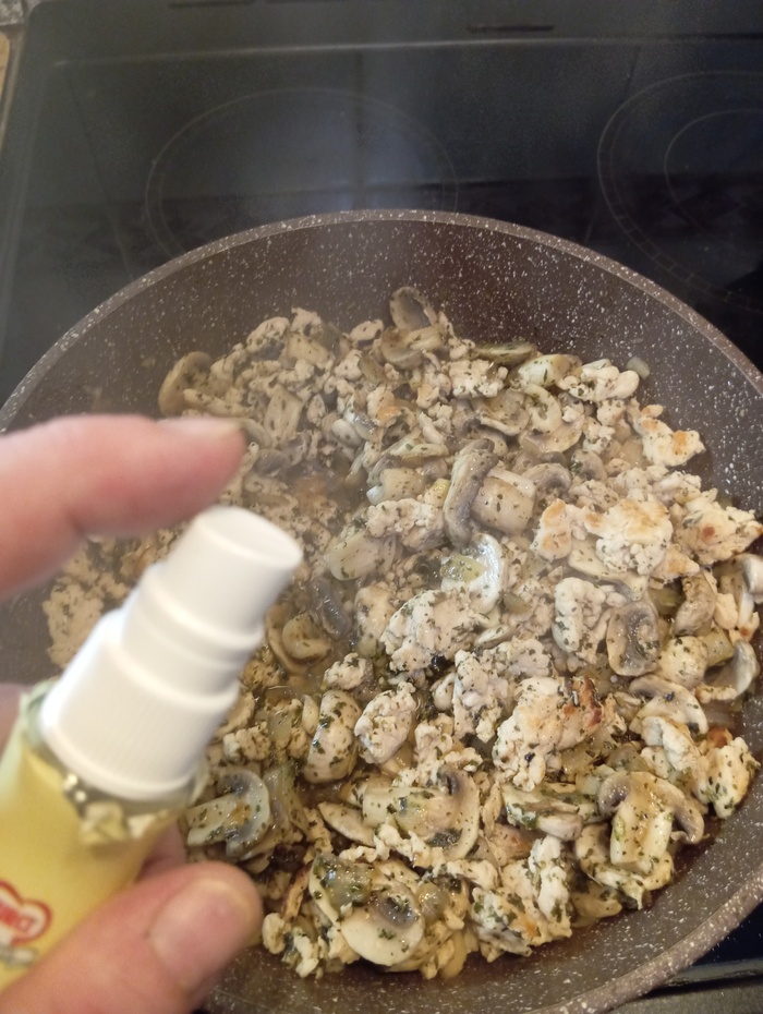 4. После обжарки к грибам и фаршу я ввёл "секретный ингридиент", 3-4 пшика трюфельного масла (в разы усиливает грибную составляющую вкуса шампиньонов), перемешал и снял с плиты.