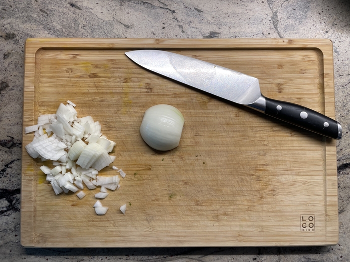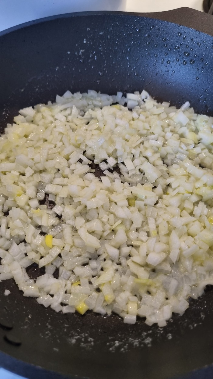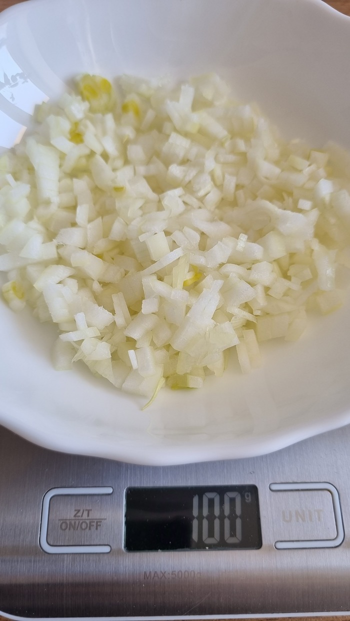 Лук репчатый - 50% от веса риса. 100 грамм. Рубаем в мелкий кубик.