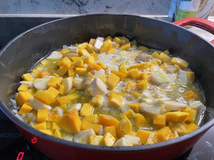 Вино выпаривается очень быстро. Поэтому дальше мы наливаем туда ~200 мл бульона. И будем поддерживать вот такую консистенцию: