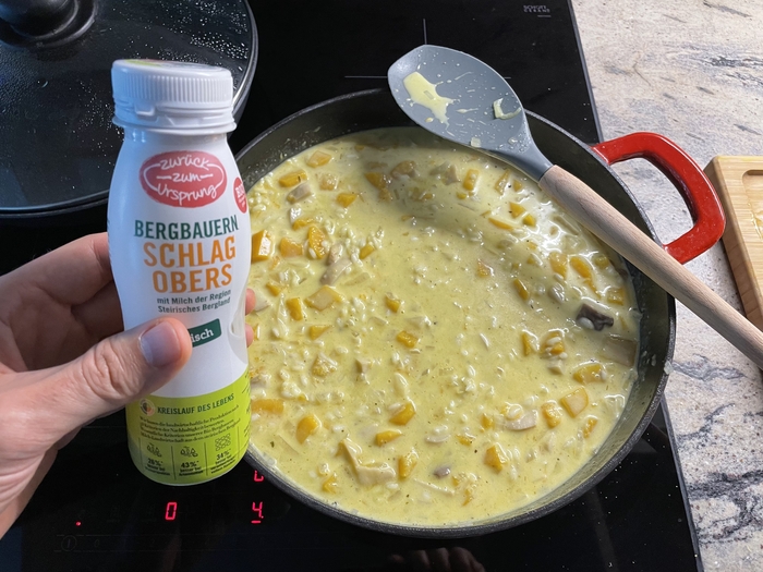 Добавил. Перемешал. Довёл до кипения и выключил огонь.