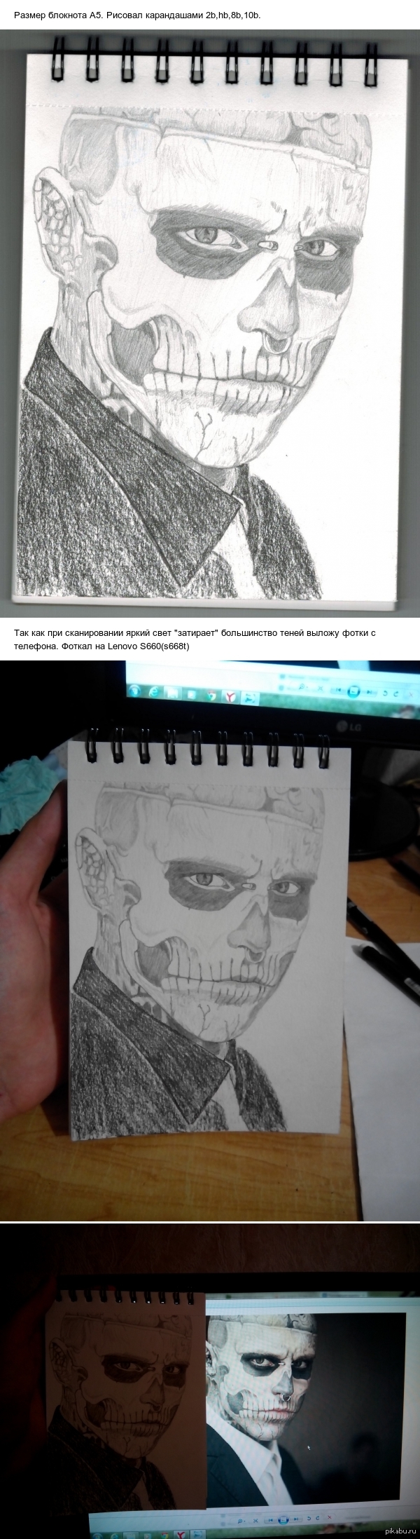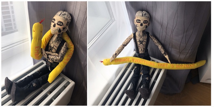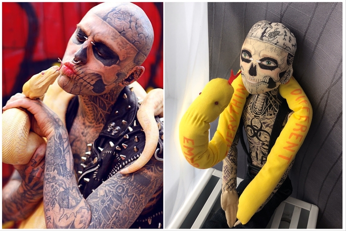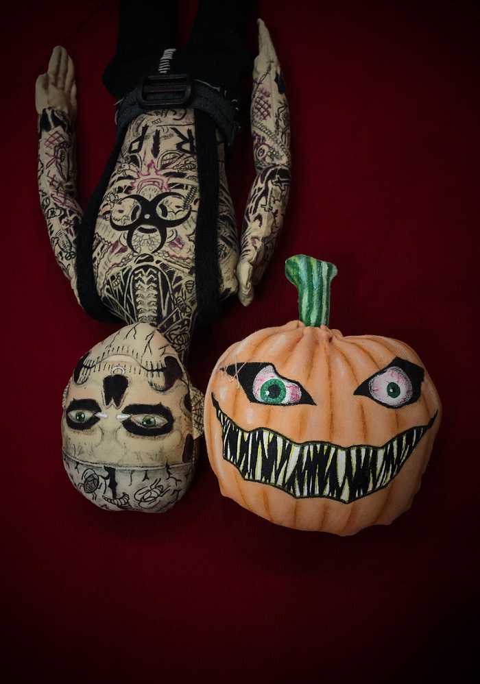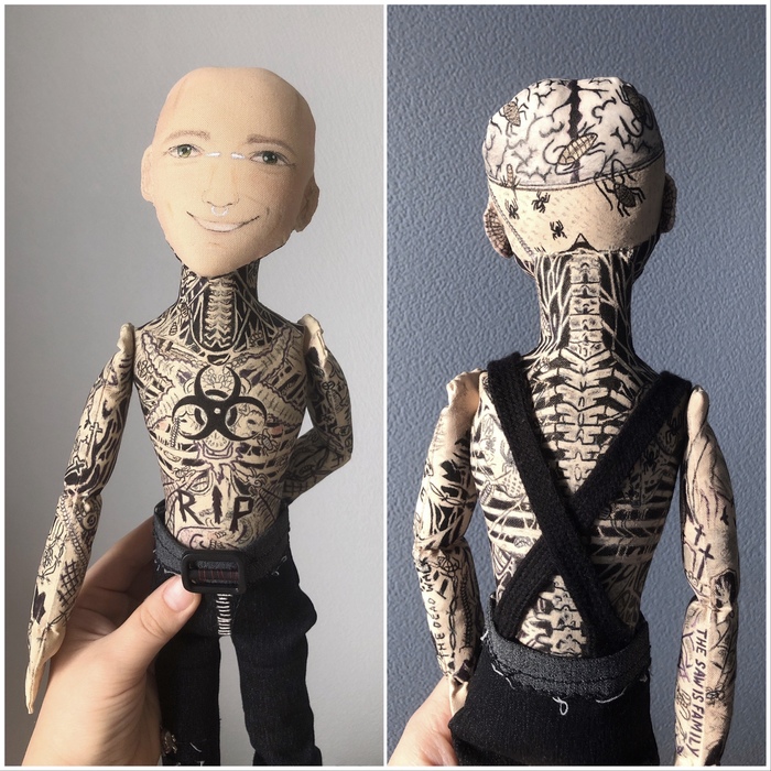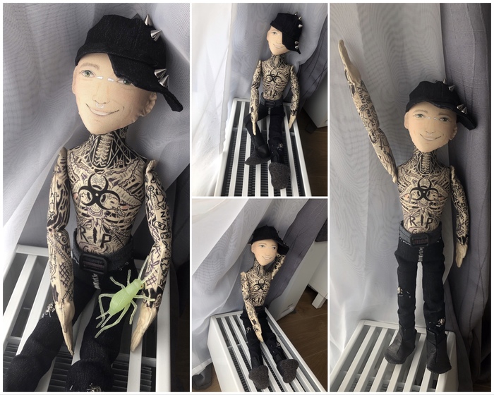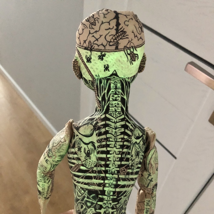 Рост 41 см, светлые части покрыты люминофорными красками - светятся в темноте. Сделала за дней 10 (с тату разбиралась).