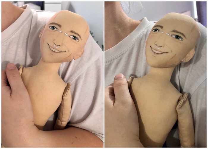 Рост 41 см, из 100% хлопка, наполнитель - синтепух. Рисунки закреплены фиксативом.