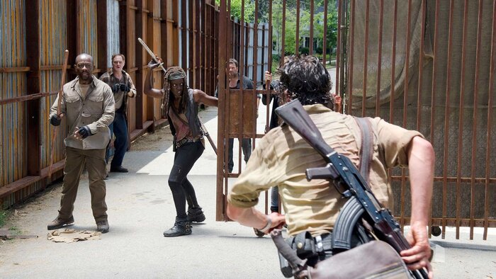 Сидят несколько заключенных у себя в камере. Еды навалом, туалет с удобствами. В картишки играют, пивко попивают и проблем не знают. Появляются герои, захватывают тюрьму, наводят суету с ходячими, отбирают у бедных заключенных половину припасов а затем и вовсе убивают их, т.к. один из них плохо посмотрел на Рика.