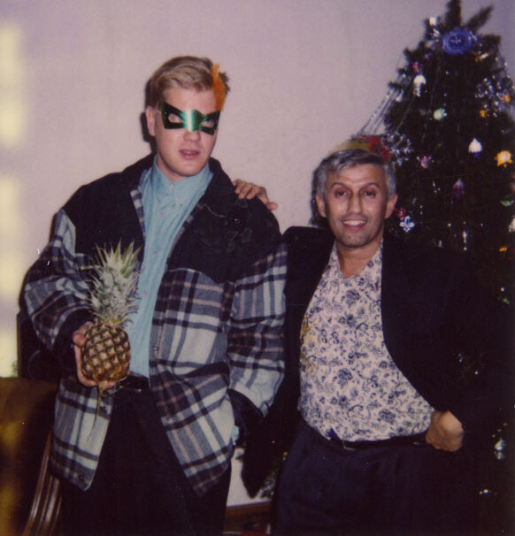 Рулевой «МузОбоза» Иван Демидов и продюсер Юрий Айзеншпис весело встречают Новый год, 1990-е годы.