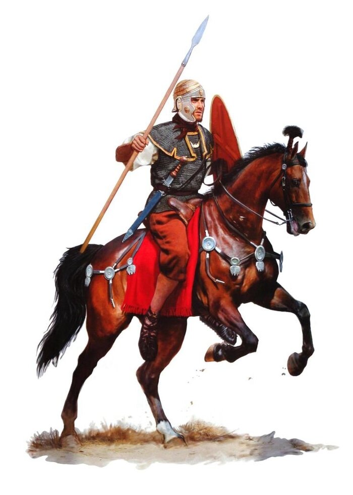 Римляне всегда были неважными кавалеристами. Особенно ясно это стало во время второй пунической воны, когда нумидийская кавалерия Ганнибала имела буквально подавляющее преимущество. Поэтому в конце республики римляне отказались от своей кавалерии и стали использовать наемную из союзных и завоеванных племен. Так Цезарь во время гальских войн имел кавалерию из галлов и германцев.