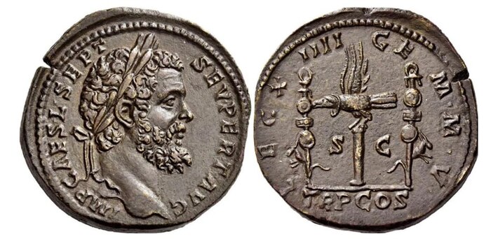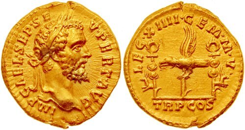 Не так часто символика римских легионов украшала монеты, но случалось. Вот, например, ауреус и сестерций, отчеканенные в 193 году. На аверсе – портрет Септимия Севера, на реверсе – аквила XIV Сдвоенного легиона (Legio XIIII Gemina).