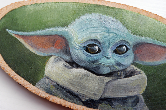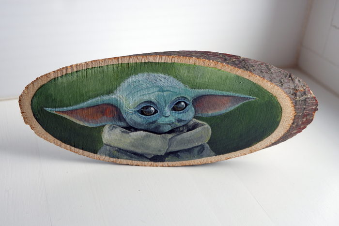 Портрет малыша Грогу в честь выхода третьего сезона "Мандалорца". Работа выполнена акрилом на спиле неопознанного дерева, возможно это врошир с планеты Кашиик!